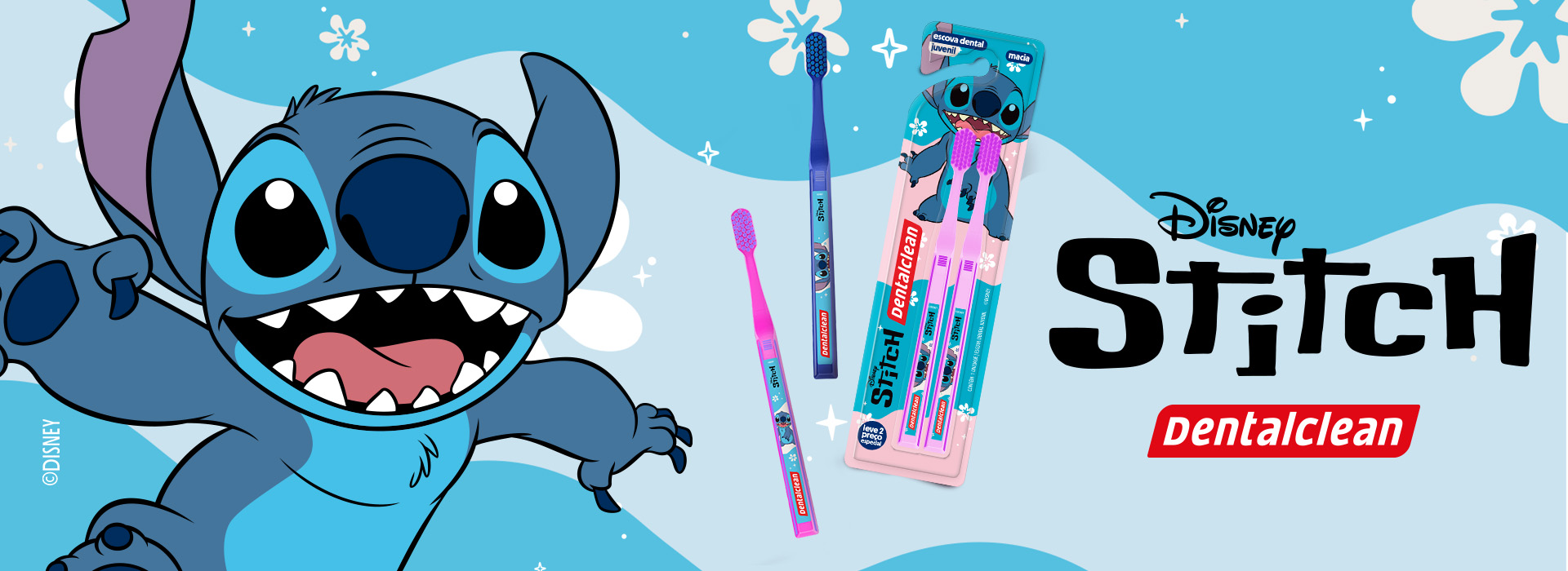 A linha Dentalclean Stitch traz o colorido e a alegria para o seu dia-a-dia. Com design exclusivo, cores descoladas e cerdas macias, leve o Stitch para ser a estrela do seu banheiro!