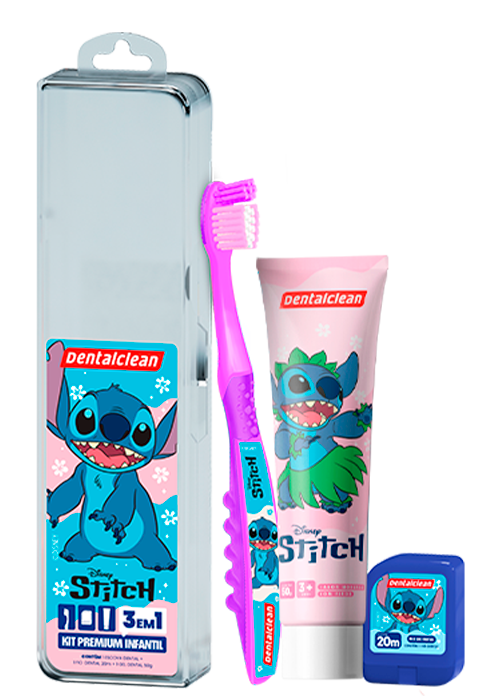 Com um lindo estojo para viagem, leve o Stitch para passear com os seus filhos na escola, no parque, nas aulas de culinária ou no futsal. A linha contém um kit completo, com Escova, Gel e Fio Dental, que manterá seu filho longe das bactérias e das cáries.