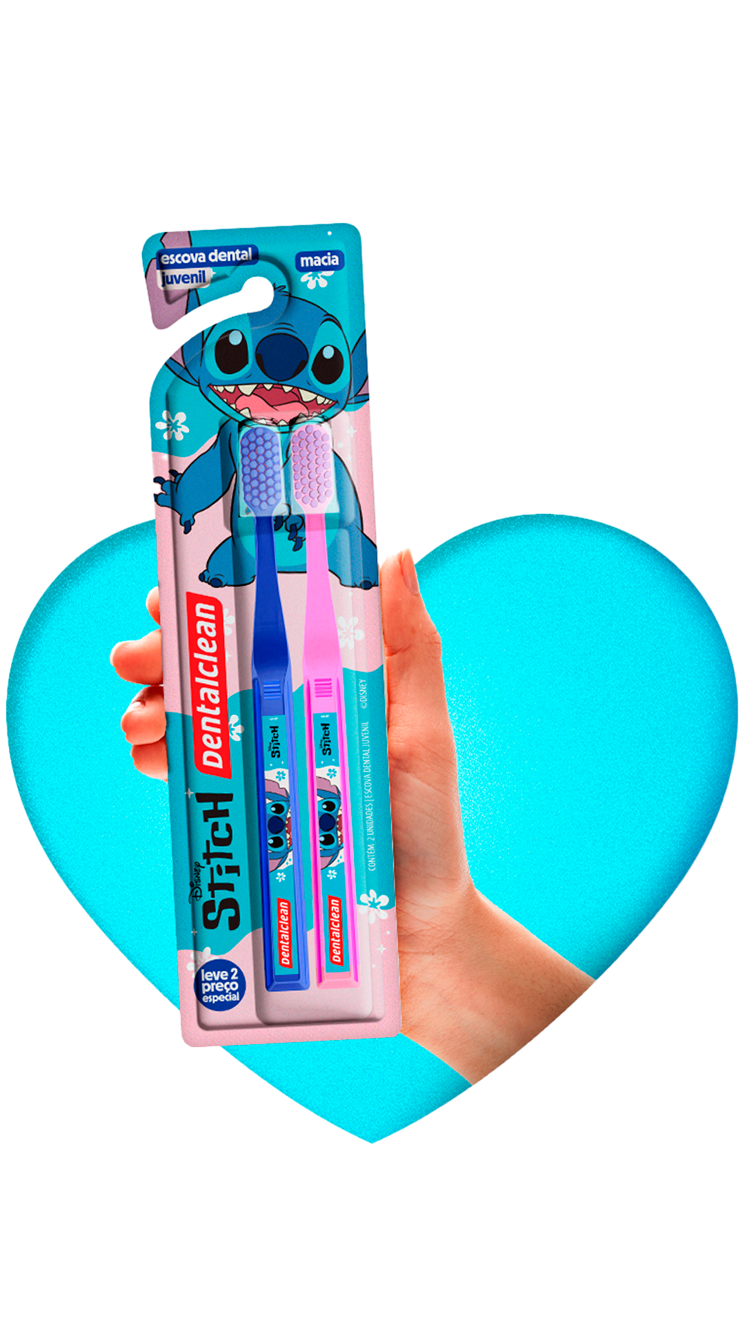 Inspirado no Stitch, o design da embalagem torna a hora da escovação mais divertida, incentivando as crianças a cuidar dos dentes diariamente.