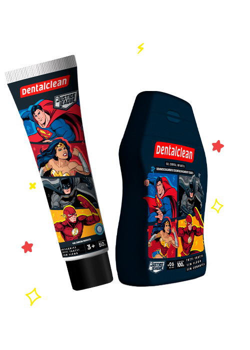 Conte com o poder dos heróis da Liga da Justiça para transformar a hora da escovação! Para crianças de todas as idades, a Dentalclean tem o gel dental da Liga da Justiça com e sem flúor. Nos sabores de Tutti-Frutti e Mix de Frutas, ele é o incentivo certo para seus filhos na hora da higiene oral.