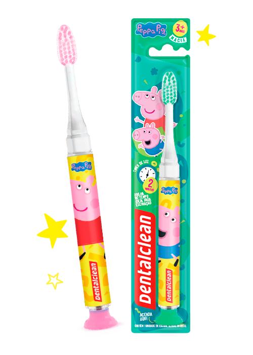 Transforme a rotina de higiene bucal em um momento divertido com a escova Peppa Pig Timer Light da Dentalclean! Criada especialmente para as crianças, ela pisca luzinhas durante dois minutos, indicando o tempo ideal de escovação recomendado pelos dentistas.
