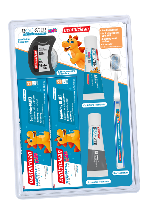 The REFIX® Kids Booster Protocol consists of two special dental gels – a crystallizer and an accelerator – which, when combined and applied to the tooth surface, form an enamel-like mineral layer. The kit also includes a soft-bristled brush, two Kids Sensitive Regenerator gels and floss to continue the protocol at home.